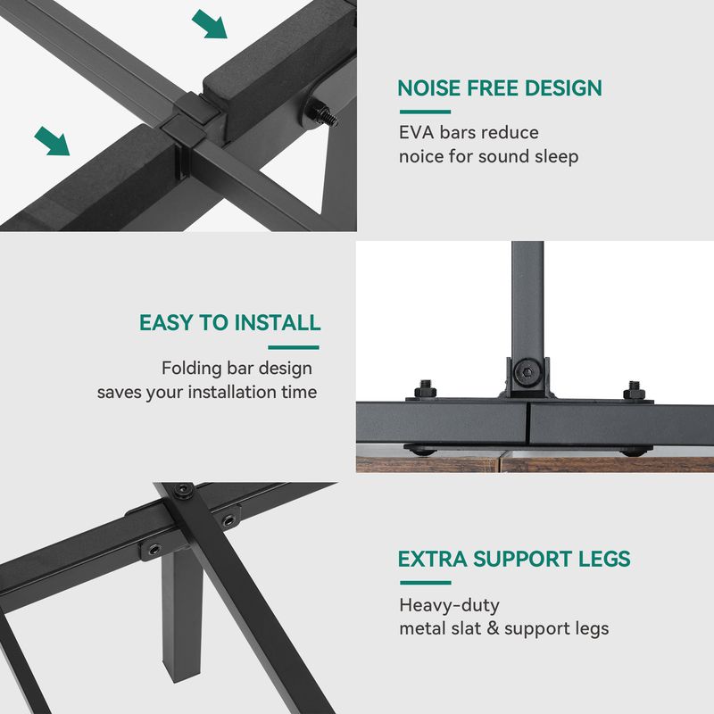 Experience stability and durability with our heavy-duty metal bed frame supporting up to 1100lbs. Robust iron frame and reinforced wooden boards offer enhanced stability. Enjoy a peaceful rest with the noise-reducing design.