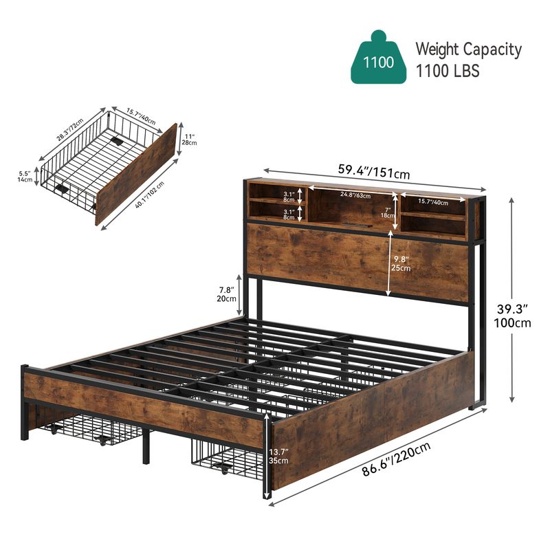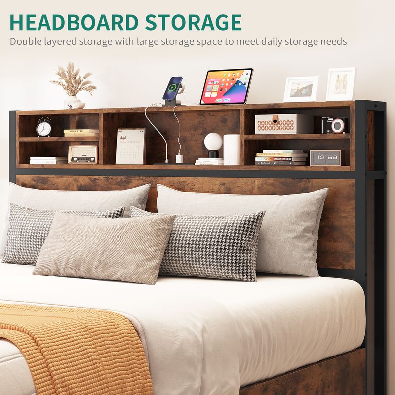 Elevate your bedroom organization with our innovative bed frame, boasting four spacious drawers for all your storage needs. The built-in power strip simplifies device charging, while the headboard’s storage shelves keep essentials within reach. Crafted with a sturdy iron frame and reinforced wooden board, this frame ensures durability and noise reduction, eliminating the necessity of a box spring. Easy assembly with included tools guarantees a swift setup. Transform your sleep space into a harmonious blend of organization and comfort.